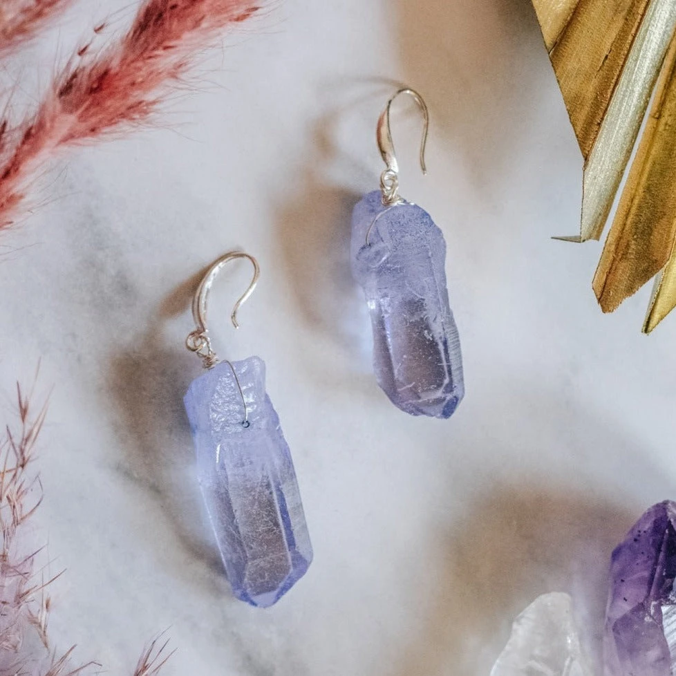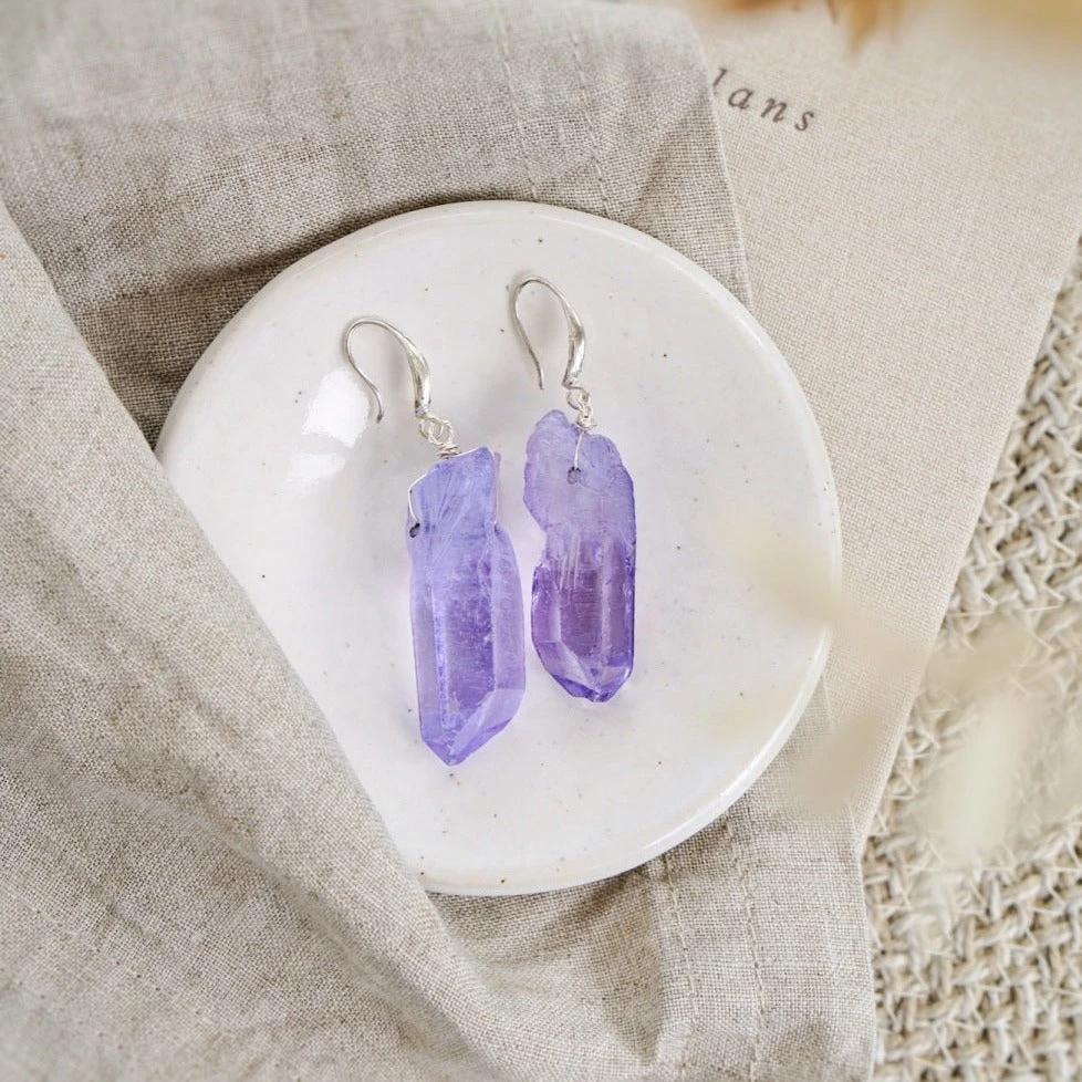 Handmade in small batches, these gorgeous earrings are made from natural Agate crystal that has been dyed this wonderful purple colour. They feature modern fish hooks made from 925 sterling silver and are wrapped in 925 sterling silver wire. Each piece is completely unique due to the natural formation of the materials used. This item of jewellery by Xander Kostroma will come lovingly gift wrapped, ready to give to a loved one, or to keep as a treat for yourself.