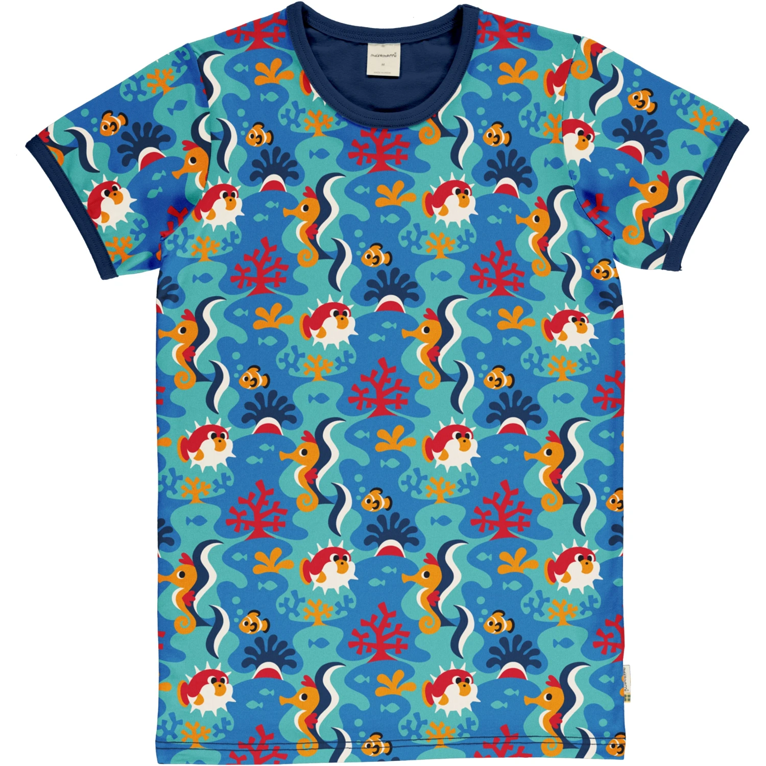Classic Maxomorra Coral Reef Scandi repeat print featuring proud yellow seahorses, white and red blow fish, little goldfish, and of course – colourful coral reefs on a turquoise background with a navy trim
