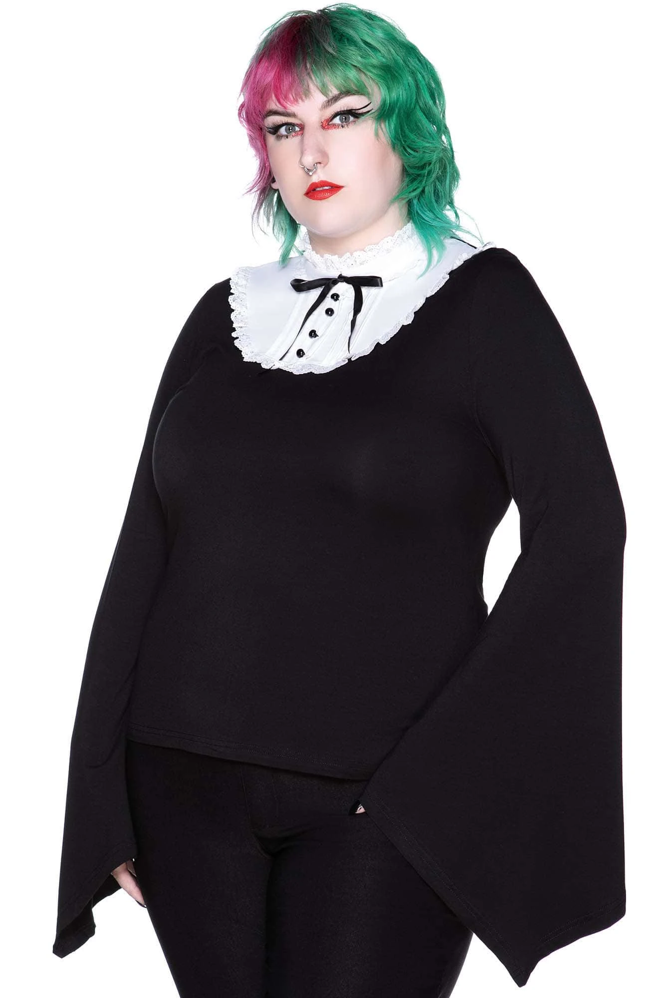 Wrap me in shadows, show me your darkness. Evoke the mysteries of the occult; the haunting ‘Arch Duchess’ top is conjured from the softest stretch fabric; adorned with a beautiful statement bib. Featuring a high-neck with ribbon tie, delicate trims and long sleeves. Perfect for date night, coven meetups or simply a day/night out the crypt!