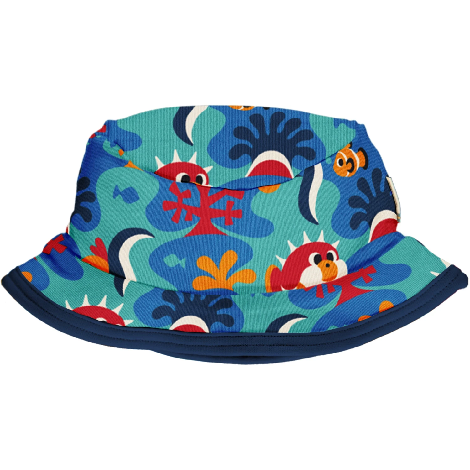 Classic Maxomorra Coral Reef Scandi repeat print featuring proud yellow seahorses, white and red blow fish, little goldfish, and of course – colourful coral reefs on a turquoise background with a navy trim