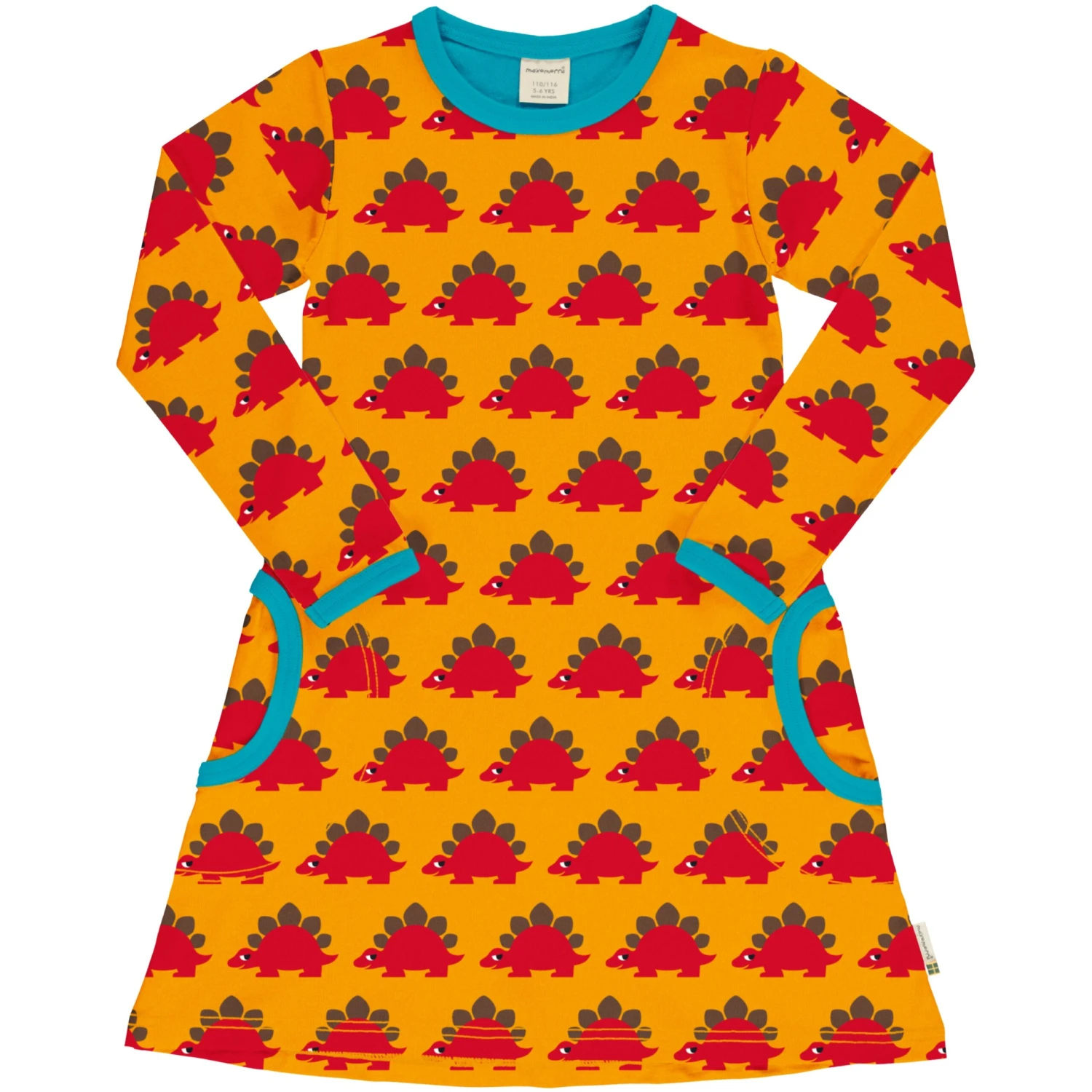 Classic Maxomorra Dino Scandi repeat print featuring red stegosaurus dinosaurs with a turquoise trim