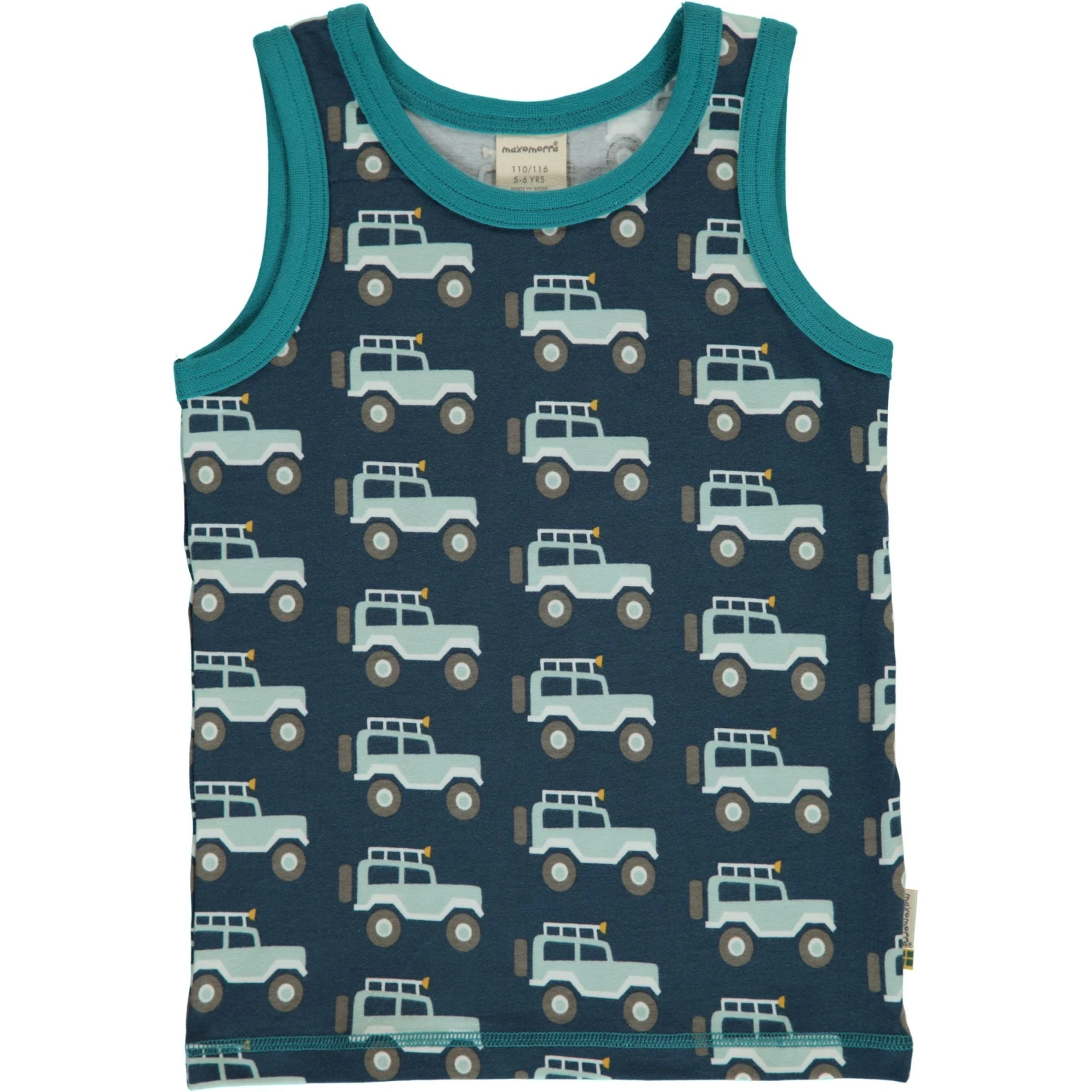Classic Maxomorra Jeep Adventure Scandi repeat print featuring funky jeeps on a navy background with a turquoise trim