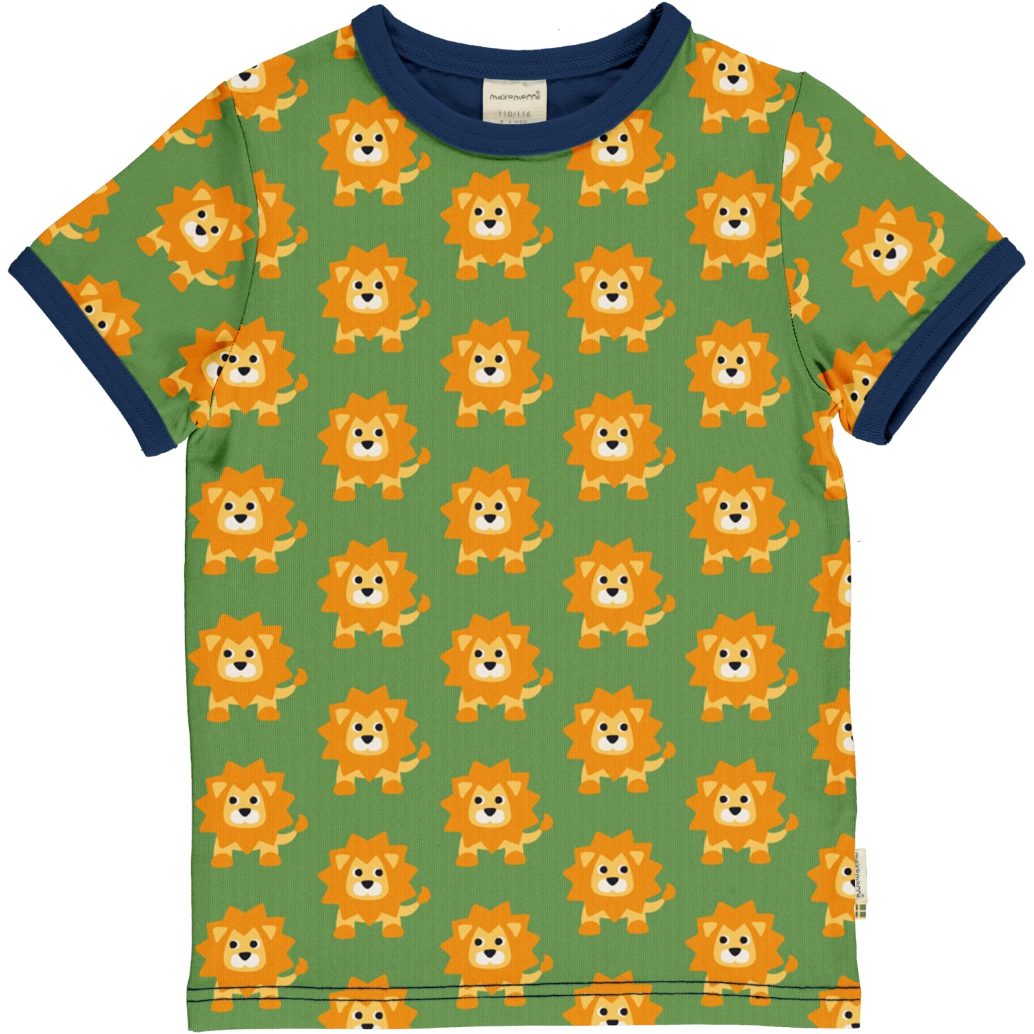 Classic Maxomorra Lion Scandi repeat print featuring curious yellow and orange lions with the spikiest, wildest manes, on a green background with a navy trim