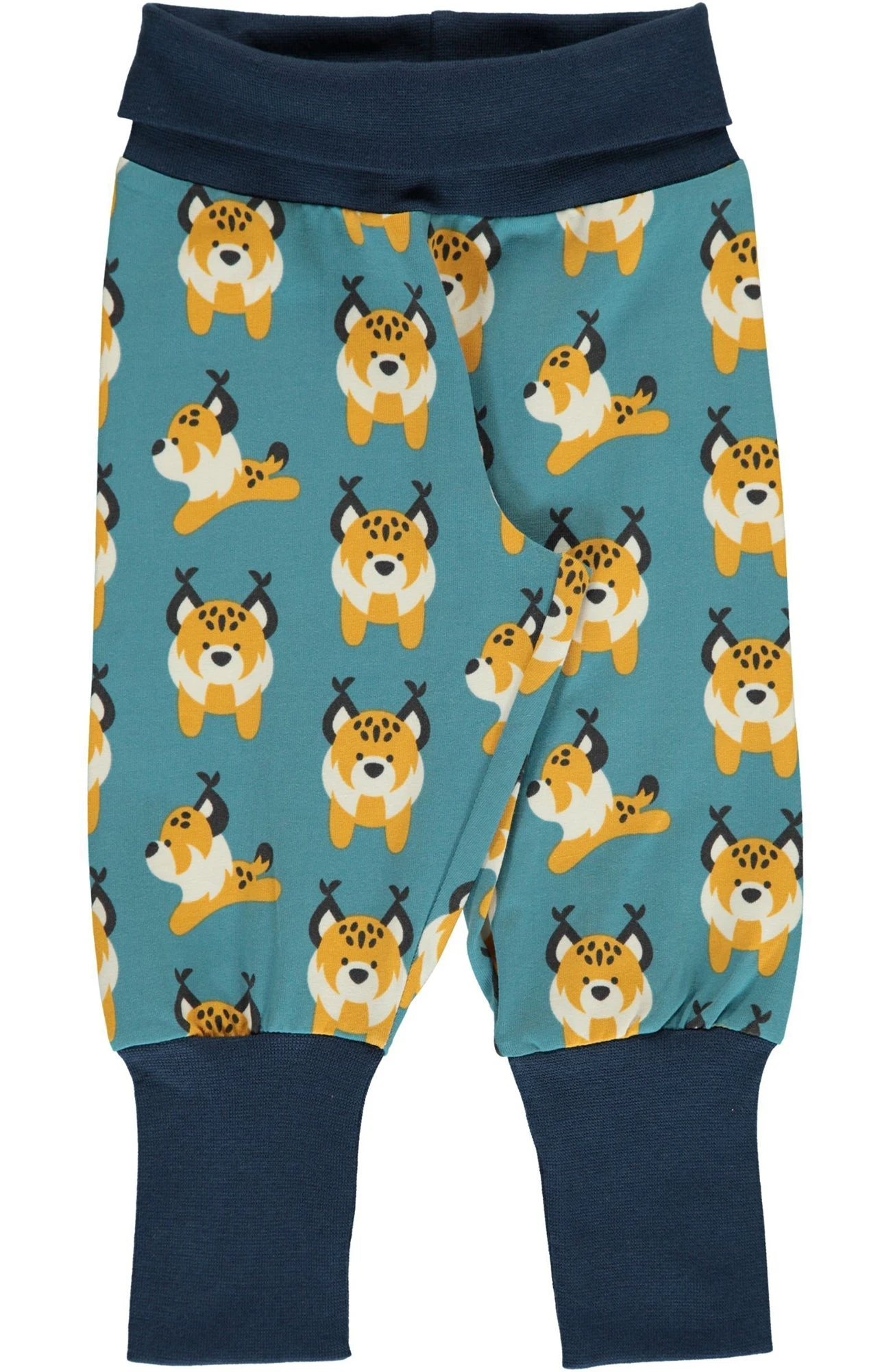 Classic Maxomorra Lynx Scandi repeat print featuring fun lynx on a soft green background with a navy trim