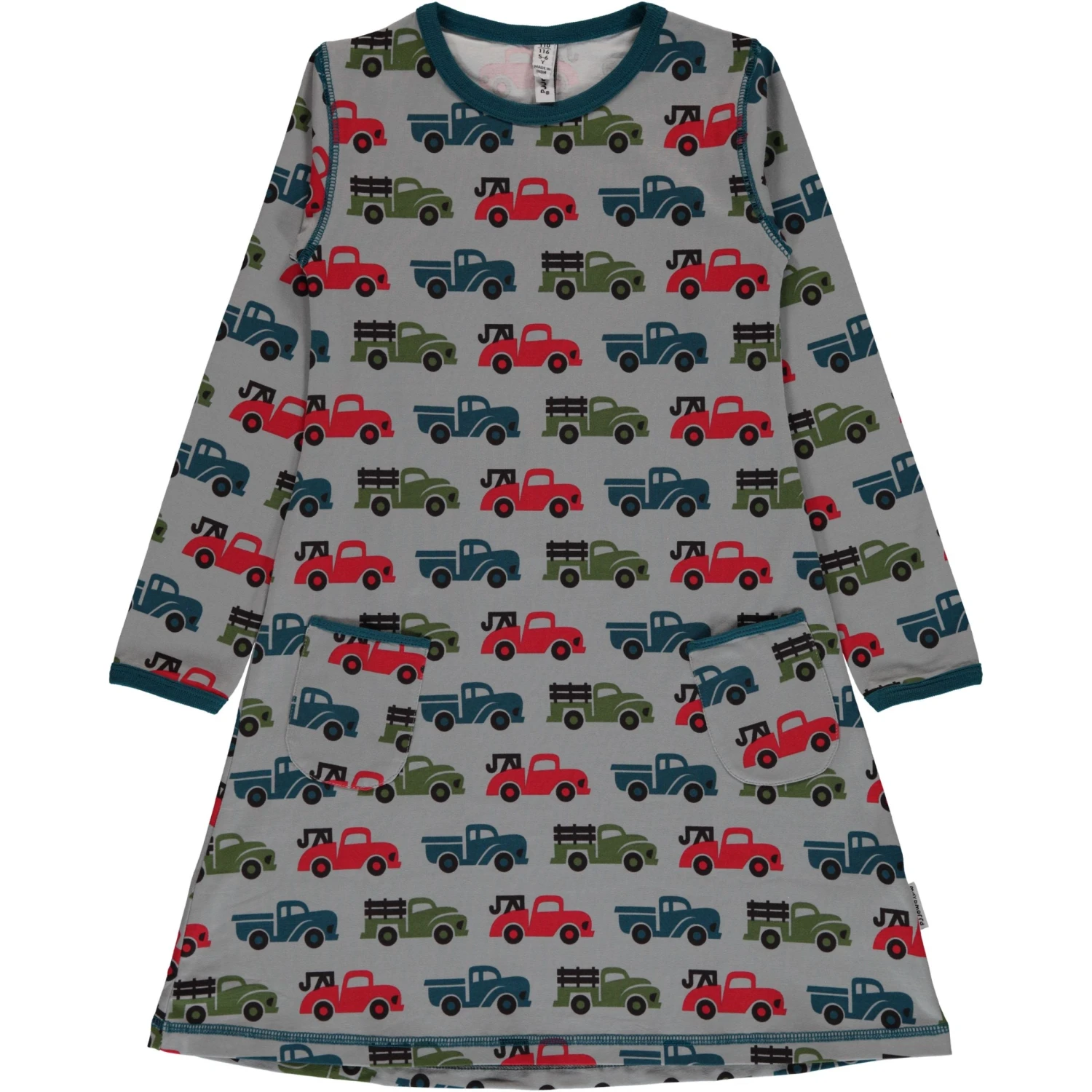 Classic Maxomorra Truck Scandi repeat print featuring colourful trucks on a grey background with a teal trim