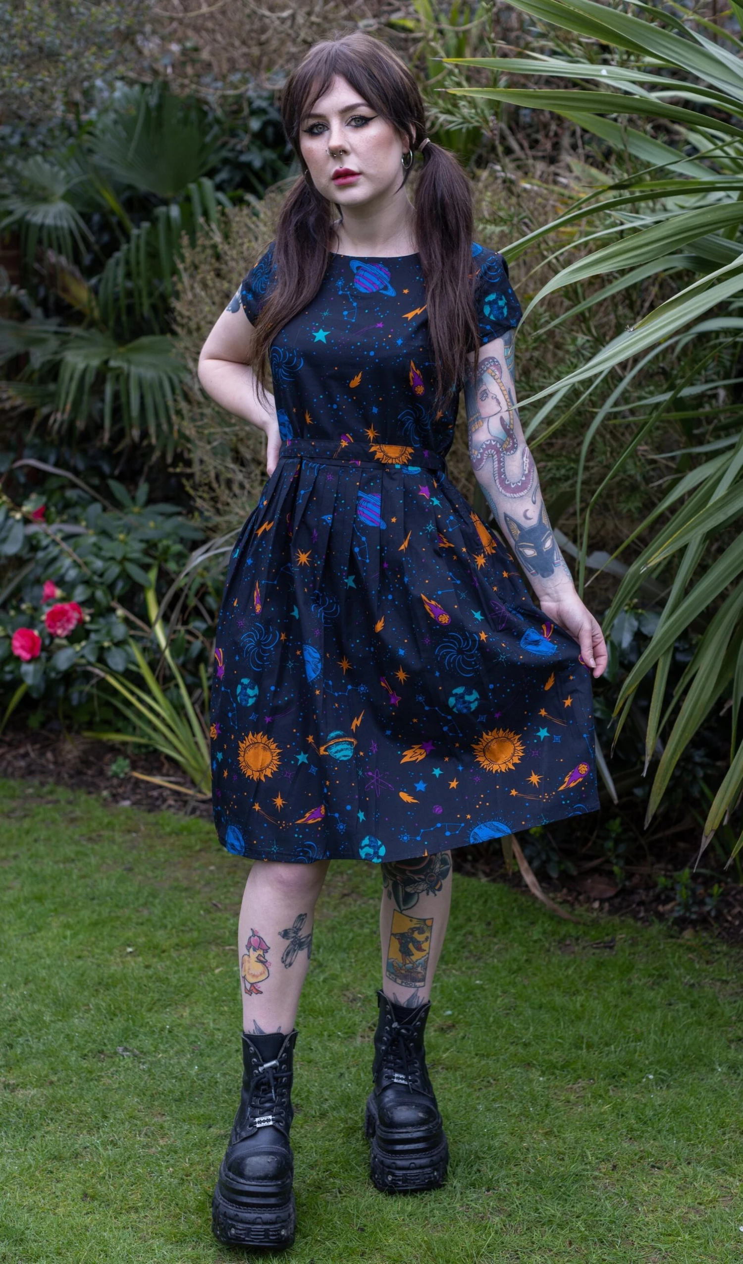 Beautiful Cosmic Space Print Dress on a Green Swirl Print Fabric. Black Base with Planets, Shooting Stars and More!