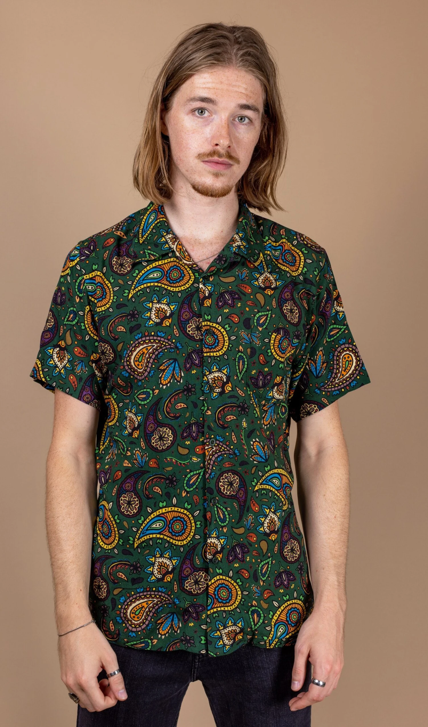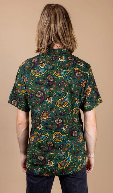 Run & Fly Kitsch Retro Forest Green Paisley Printed Short Sleeve Shirt
