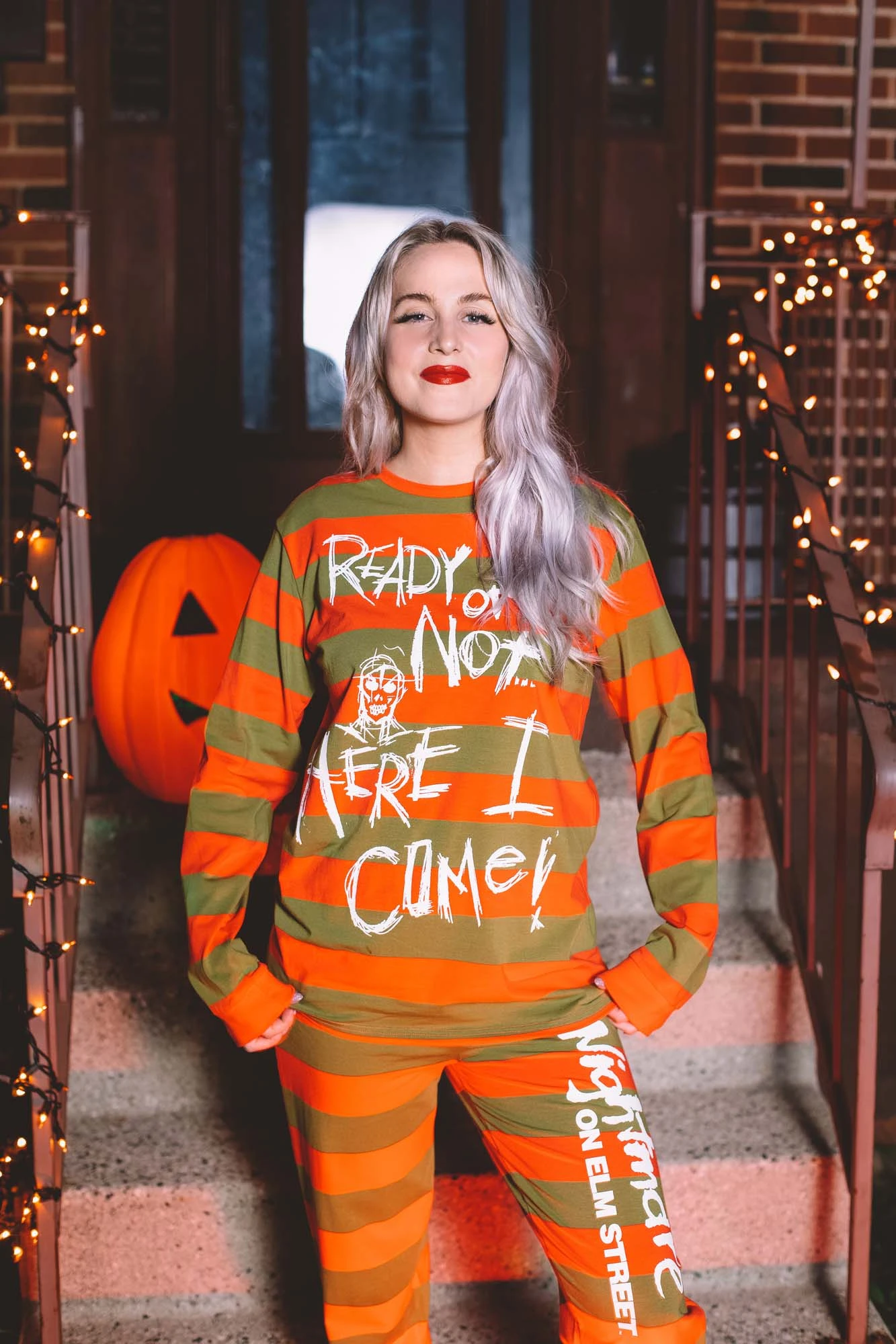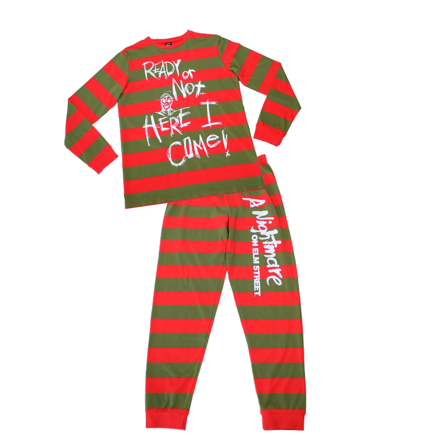 A NIGHTMARE ON ELM STREET PJ set, does it get more perfect than that? Inspired by FREDDY’S iconic clothes, this PJ set will keep as cozy as you can be heading to bed at night. This truly comfy and stretchy set features printed details of ‘Ready or not, here I come!’ on the front and the movie logo on the pant leg.