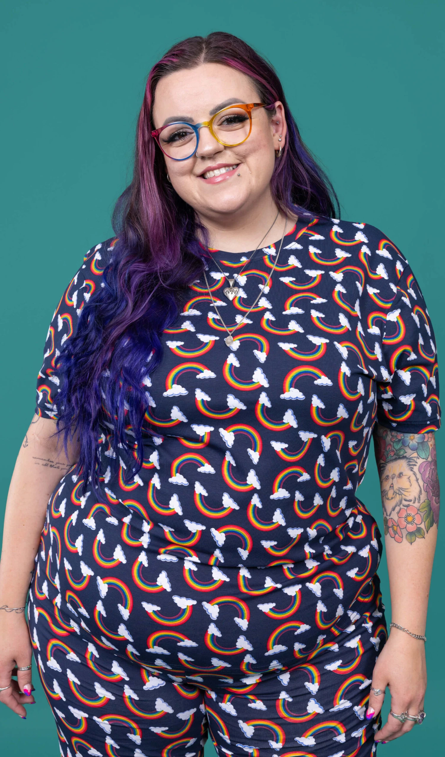 Experience bright and whimsical fun with Over the Rainbow & Clouds T Shirt. The vibrant rainbow design and fluffy cloud sleeves add a touch of playfulness to your wardrobe. This short sleeve shirt is sure to bring a smile to your face and brighten up any day