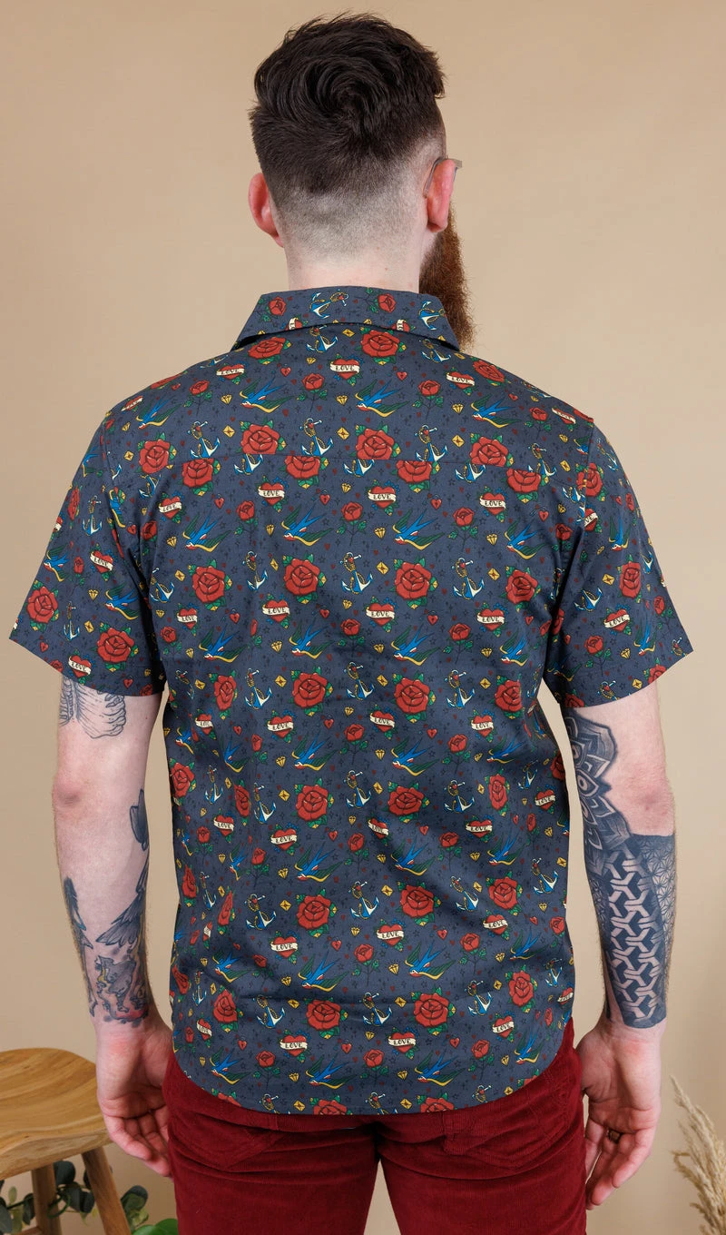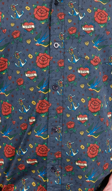 Run & Fly Kitsch Retro Old School Tattoo Print Shirt with short sleeves and branded summarys.