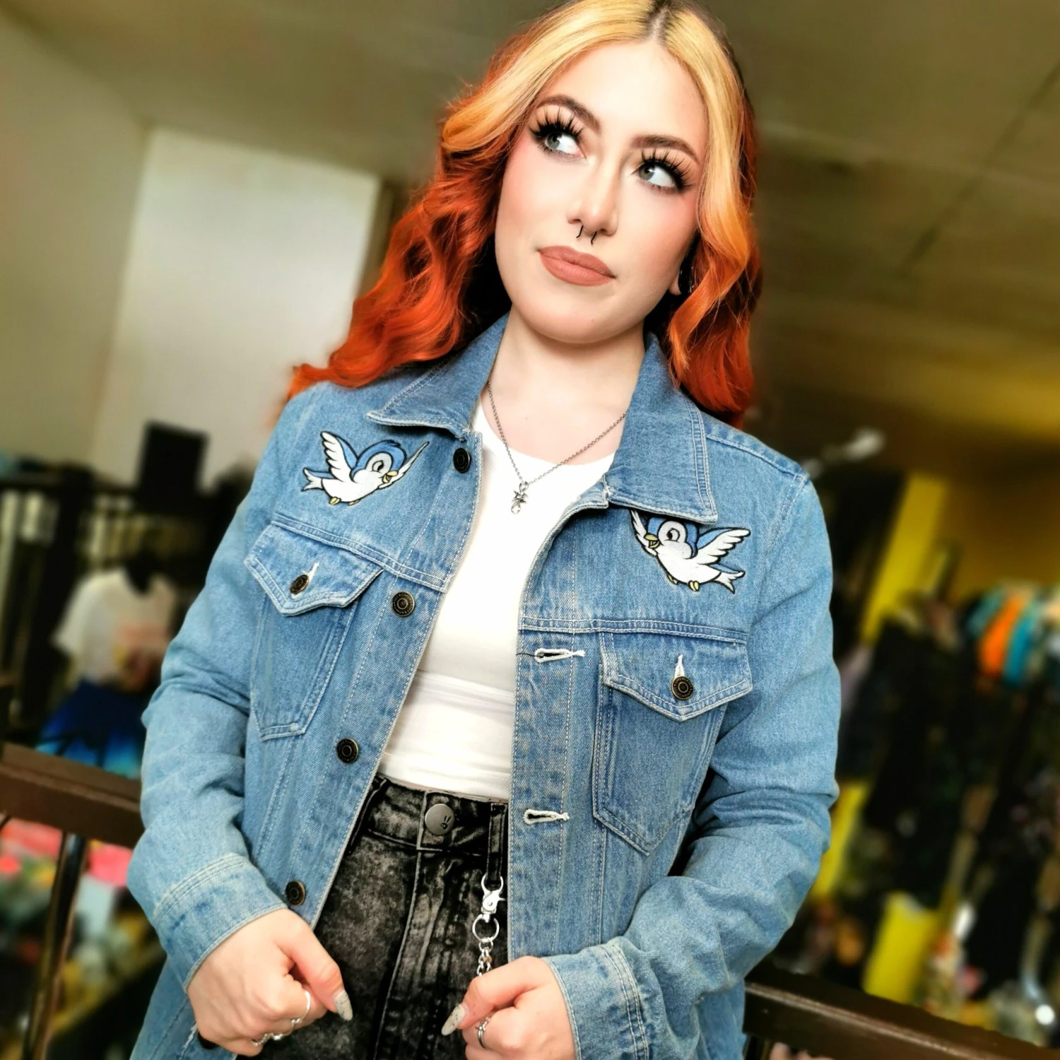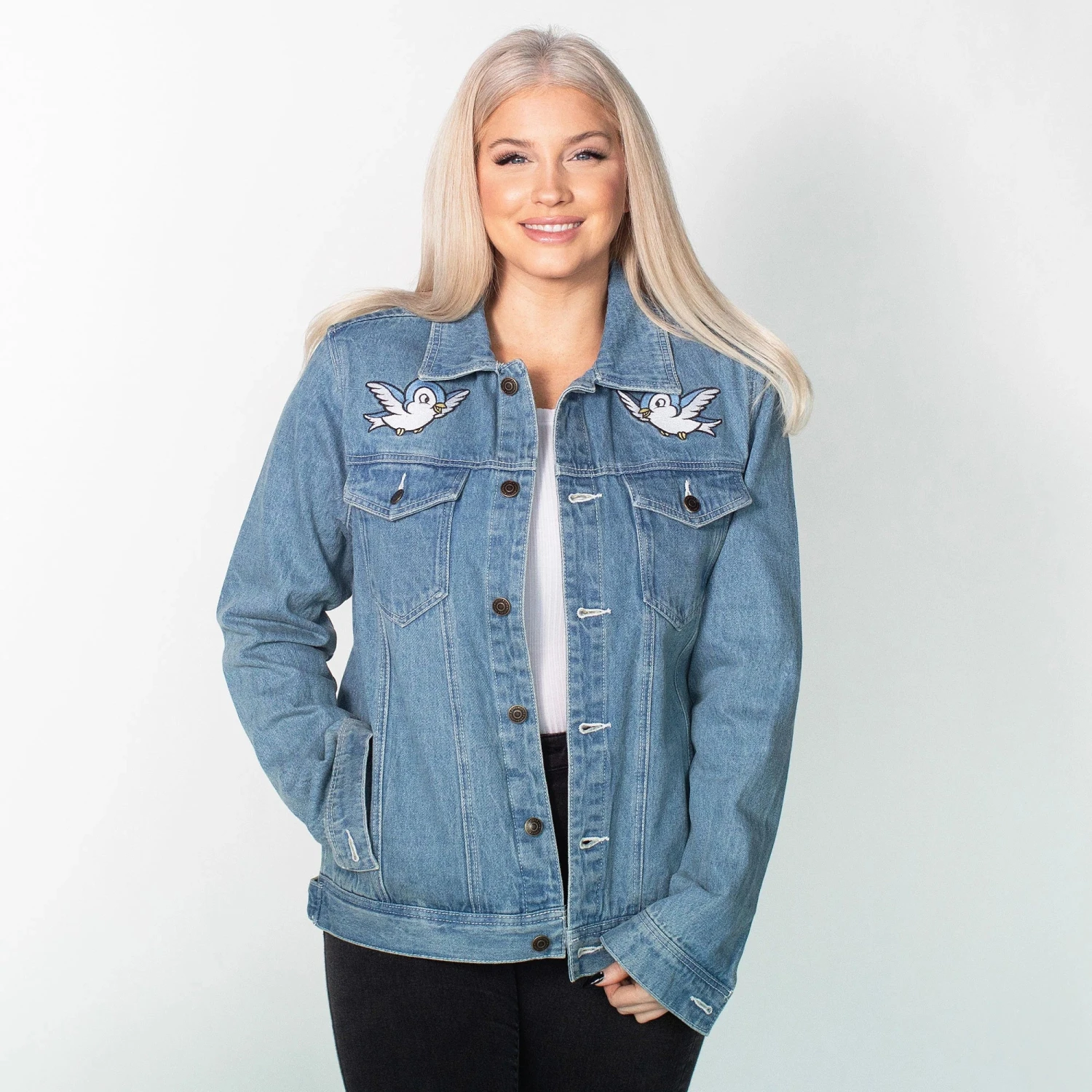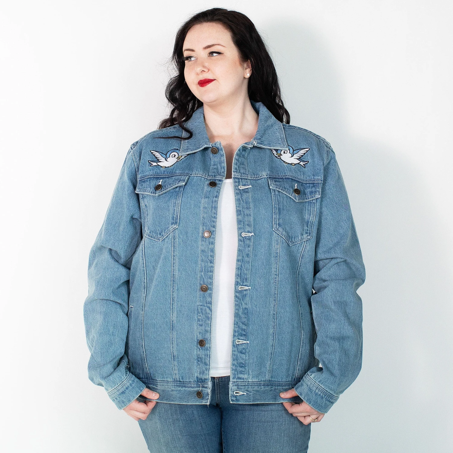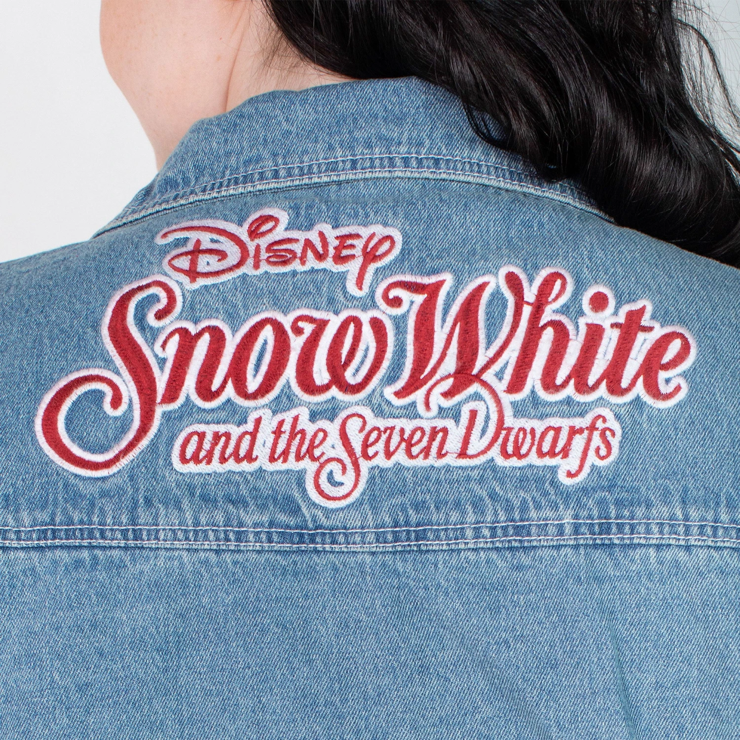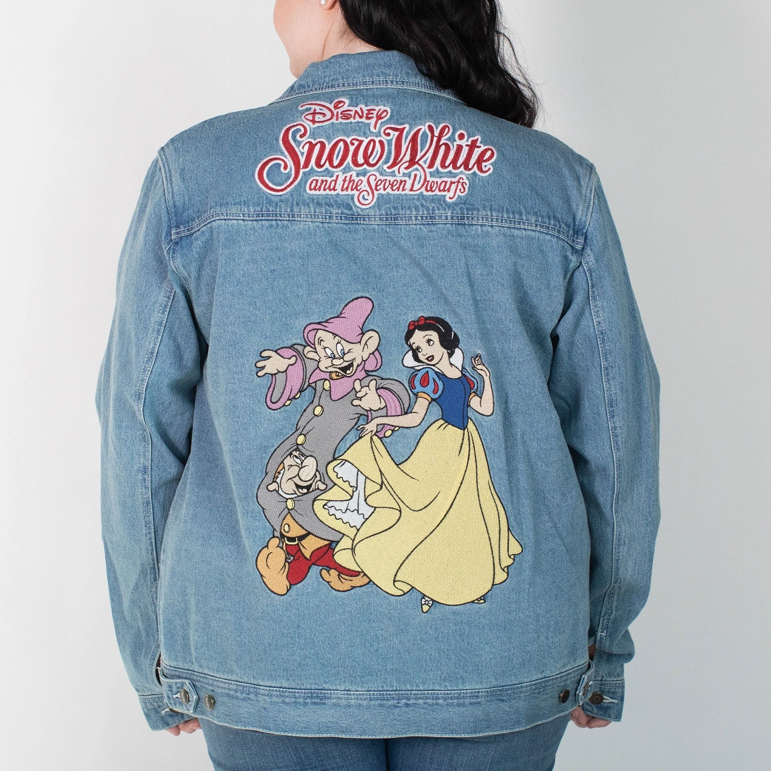 Perfect for a trip through the woods to a cabin full of dwarfs, or perhaps just to hang out with friends—our Snow White Anniversary Denim Jacket is the fairest of them all! Made of 100% cotton denim, this jacket also features Dopey, Sneezy, and Snow white embroidered on the back, and Snow White’s blue bird friends embroidered on the front.