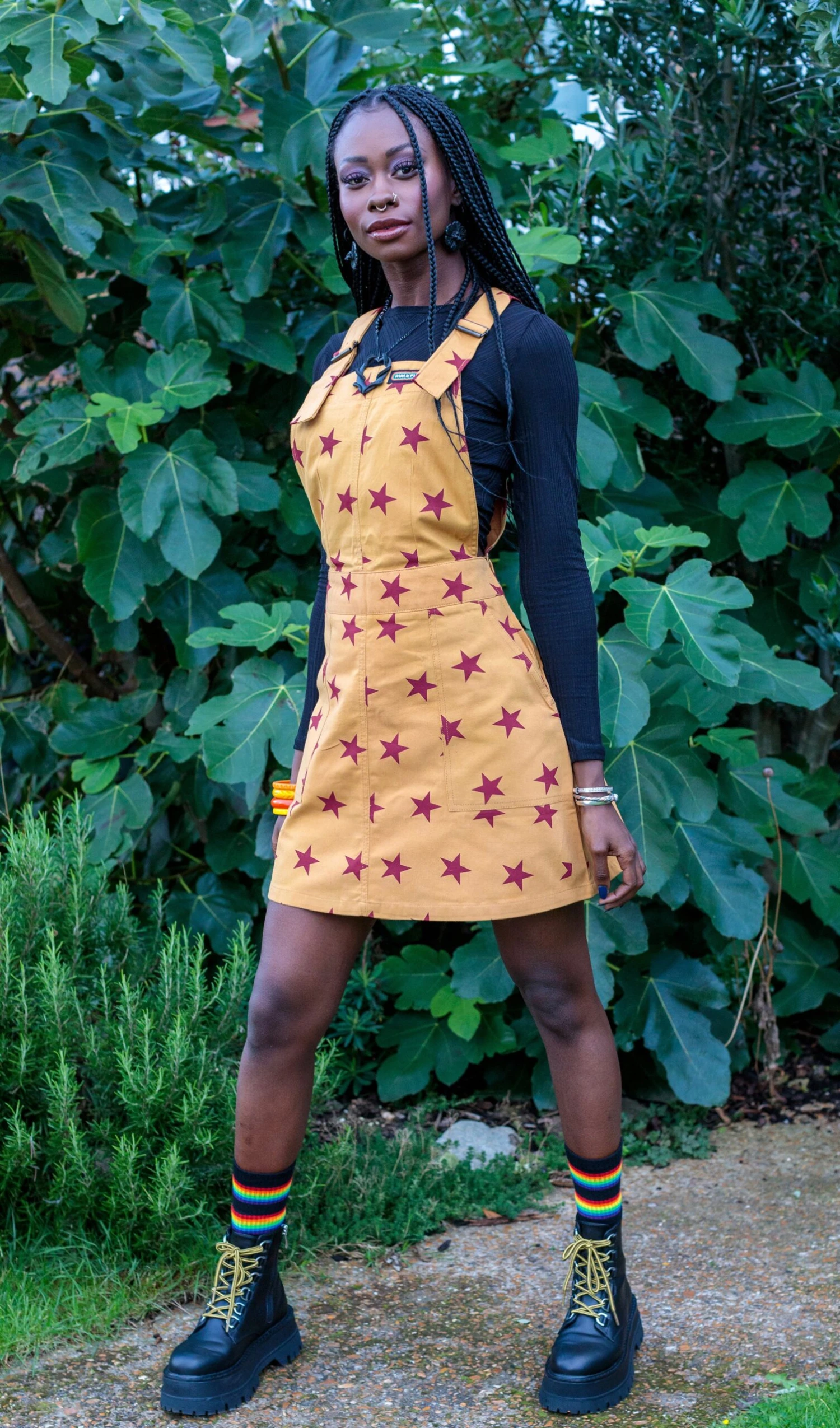 Star print pinafore dress. In a stretchy twill.