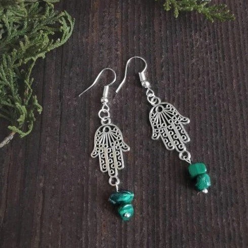 These earrings are hand made and feature Hamsa Hand pendants with Malachite semi precious stones to finish. They’re perfect for the day to complete your casual look.