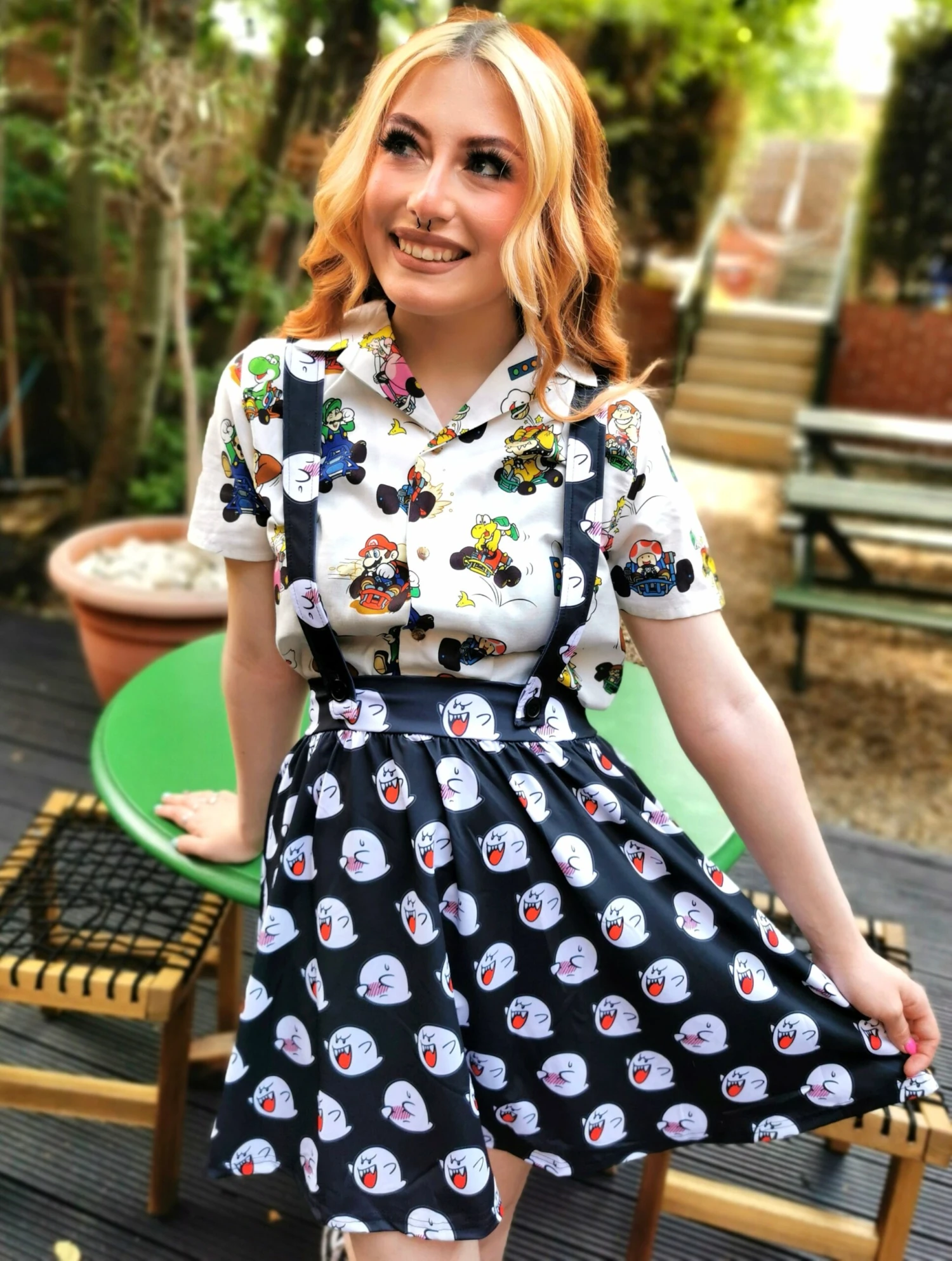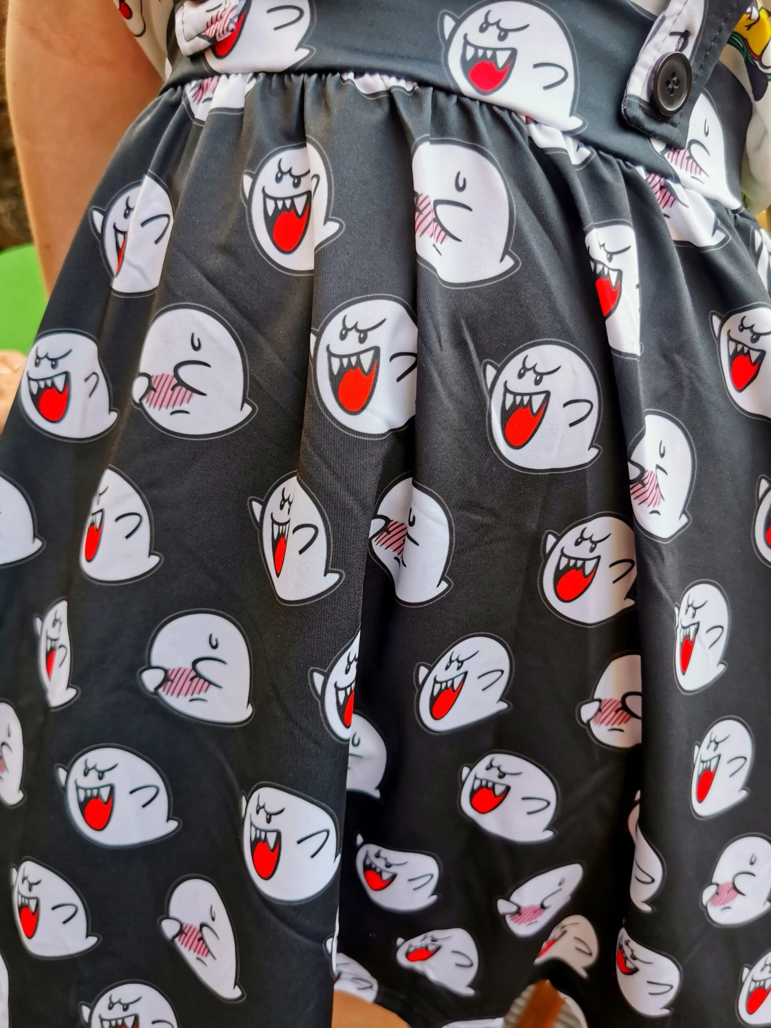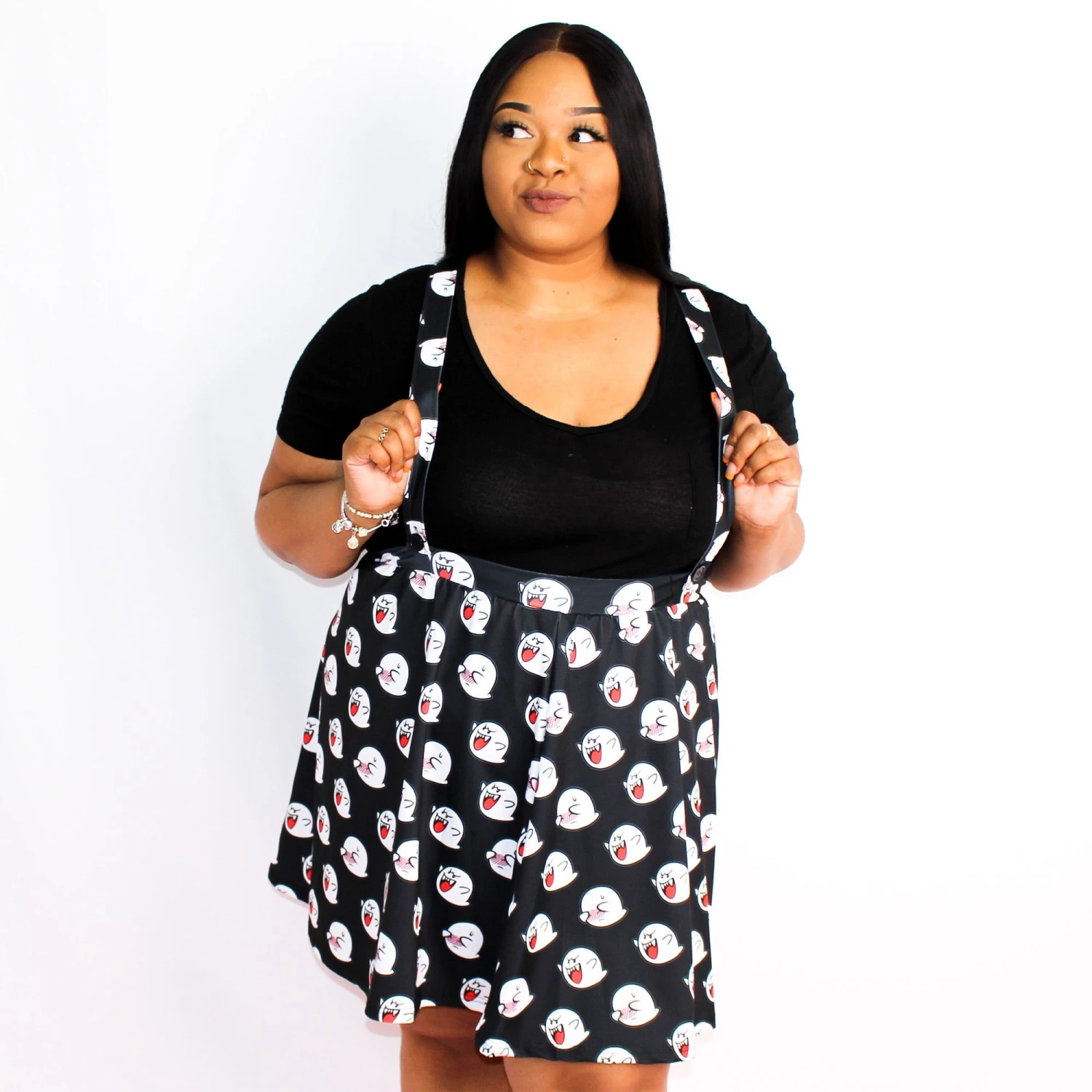 Let us introduce to you the Super Marioβ’ Boo Overall Skirt! This statement piece has a stretchy, comfy fabric making it easy to dress up or down! In addition, this overall skirt features a bright and bold all-over print pattern of Boos! Just donβt look directly at them β¦ or the pattern might disappear π