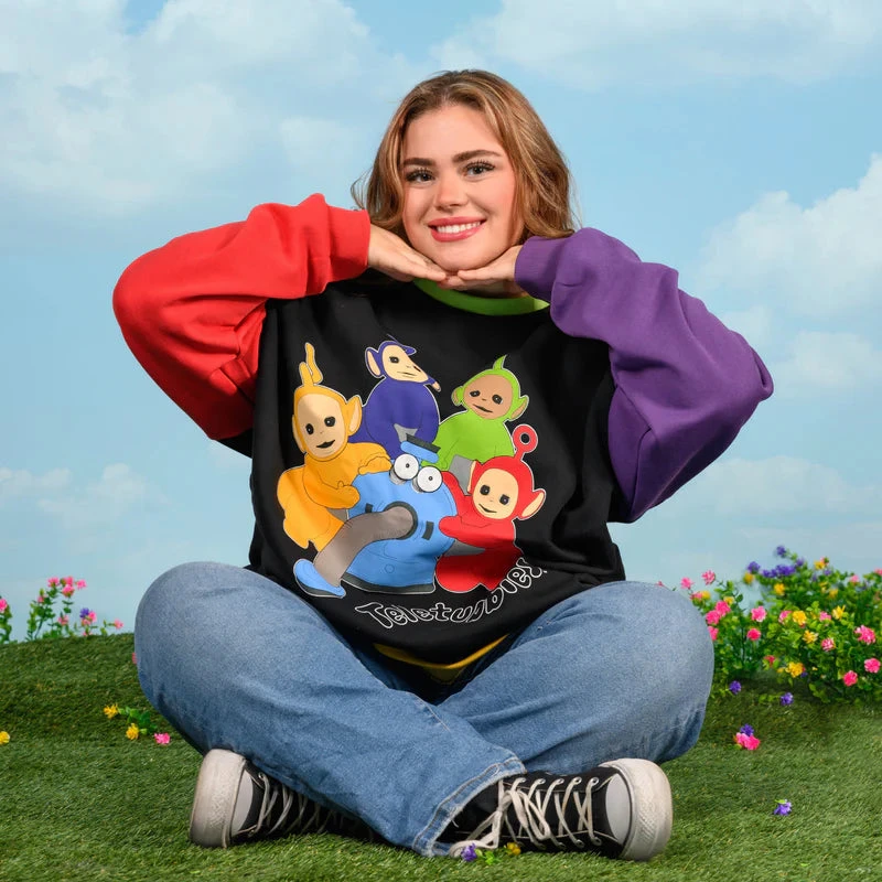 The ultimate throwback straight from Teletubbyland. Cakeworthy’s Teletubbies Drop Sleeve Colour Block Crewneck is here and features your childhood favorites, Tinky Winky, Dipsy, Laa-Laa, Po, and even Noo-Noo. This crewneck brings the whole gang together in one colorful, cozy masterpiece.