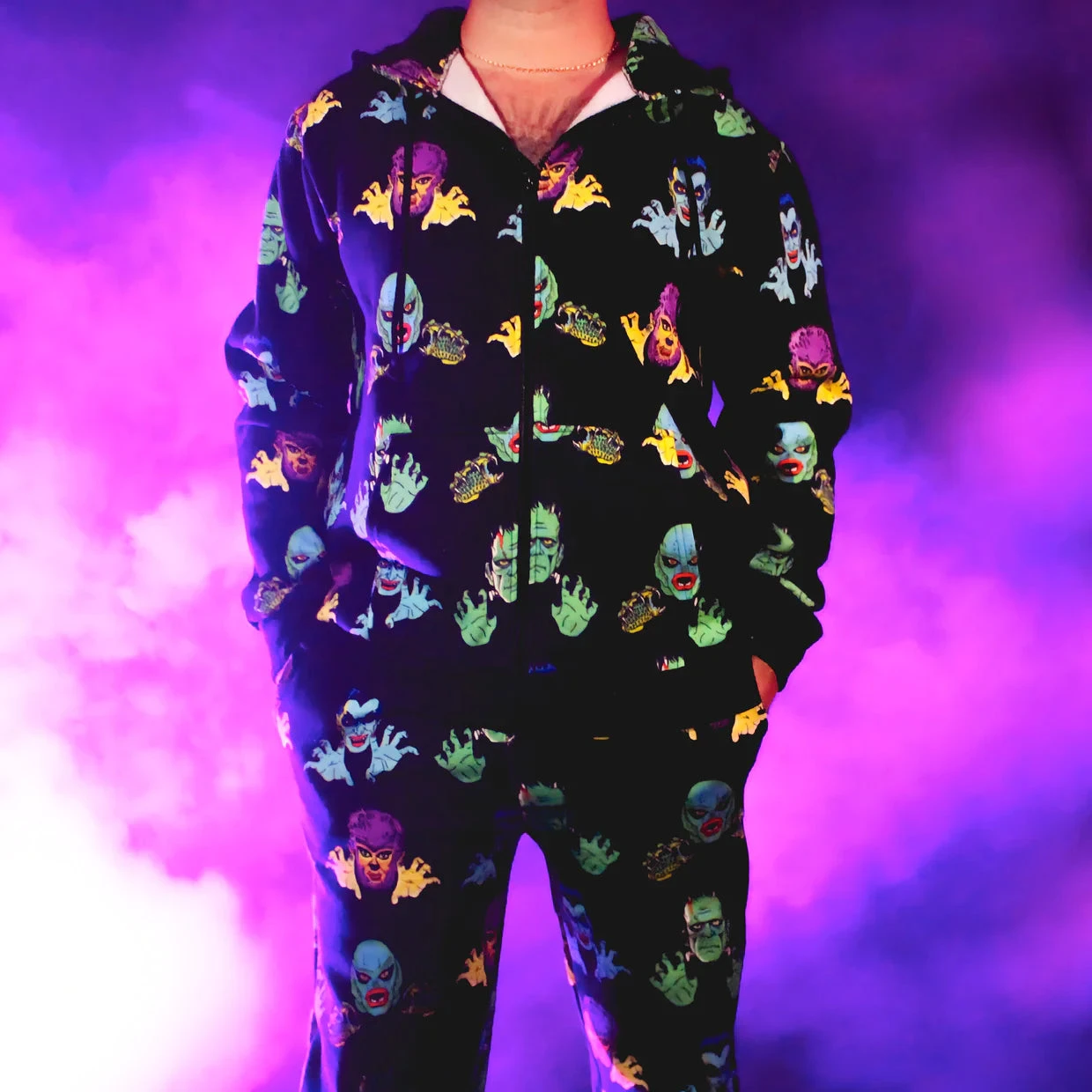 Cakeworthy just got a little bit spookier! This Universal Monsters x Cakeworthy Hoodie is a necessity for any monster maniac. With a drawstring hood, two front pockets and printed graphics featuring the Creature from the Black Lagoon, Dracula, the Wolfman, and Frankenstein in an all-over print, this is the perfect addition to elevate your ghoulish wardrobe.